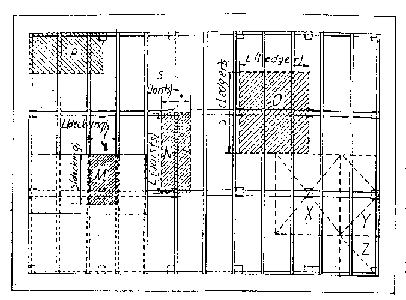 混凝土版的施工載重,由襯板承受後傳遞至襯板下之格柵角材,再由格柵角材傳至格柵下之縱梁(stringer or ledgers),最後由縱梁傳遞至縱梁下之支柱(shores or props),各構材載重承受分佈面積如(圖三)混凝土版施工模板系統平面圖所示。