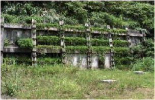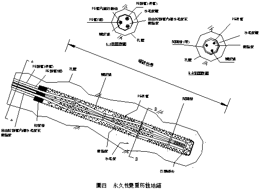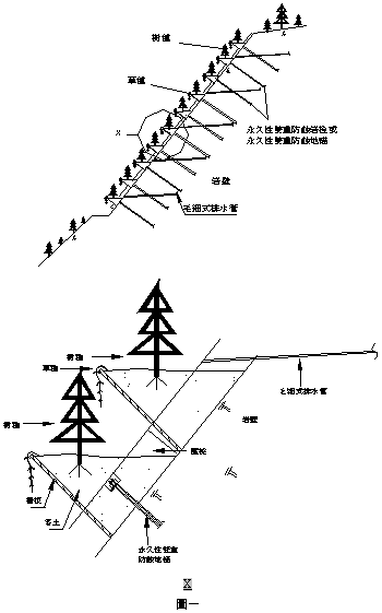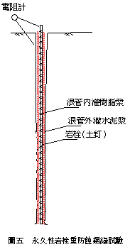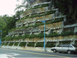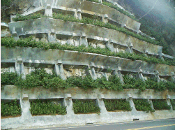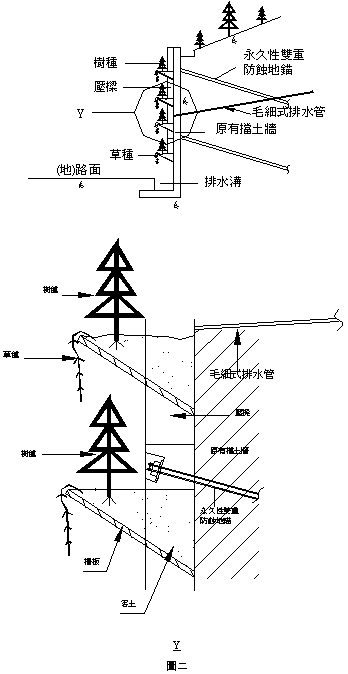 一、行政院公共工程委員會函 依(90)工程技字第90029307號:基於地錨工程之設計,施工方式常因不同之工程特性及工址之地質條件而異,設計單位可依其設計與施工需求調整施工部份規範,以維工程品質。二、七二水災後 誠如成大水利系詹錢登教授所言:「雨下得特別大是事實,但是不是異常就很難講。從賀伯、桃芝到敏督利都被歸為異常,然一而再,再而三發生,是否還能被稱為異常?或把它視為常態中的某一種情況?我們要對這種極大雨量的狀況,做好心理準備。」台灣地理環境特別,高山峻嶺,地形陡峭,河川水流湍急,尤其在921大地震後山區地鬆,遇豪雨就像拉肚子,中橫生態工法上邊坡一蹋糊塗,甚受批評。93年7月6日自由時報七二水災防洪檢討中「一位水保局的員工便表示,生態工法雖比工程工法更適合山坡地的整治,但兩者應並行,尤其是在居民安全的考量下,工程工法比生態工法更為重要,如河床的整治,便不應全然用生態工法。台大地質系教授陳文山便認為生態工法確有必要但非唯一,國外的山坡整治並非全部採用生態工法,有些地區用工程工法,只是外加植物覆蓋,因此讓外界誤以為是採生態工法,因為工程工法有其安全性的考量。」台大土木系陳振川教授亦指出打樁編柵的生態工法具美化景觀之目的,卻無法調整內部結構與支撐點。三、裡外兼顧的工法 台灣岩盤之特質為砂頁岩互層,有順向坡、逆向坡和斜絞坡,以砂頁岩互層之層脈為主要連結面,只要置縱壓樑,以永久性樹脂漿地錨拉住,調整內部結構與支撐點,橫面已有岩盤層面支撐只要有被動土壓壓住即可,而被動土壓以柵板柵在壓樑與壓樑所留置之凹槽,再回填客土植生,一舉兩得,且達到美化景觀之目的,並在壓樑與壓樑間鑽孔,置入毛細式排水管,排出多餘水份,減少土壓。柵板及壓樑均可預鑄式施工,快速、省時。在國科會小型產學合作計劃的補助下,廖洪鈞博士及其指導的博士生郭治平在隸屬台科大的基隆大武崙坡地試驗(如相片),植生、綠化兼保固。台北縣雙溪鄉都市計劃道路邊坡工程,該山坡呈75度,以格樑、柵板置客土,植山櫻花(如相片)。本工法已有實驗及實際工程之使用,效果良好,安全快速又經濟。四、本工法之施工步驟 本工法係提供陡峭岩壁或擋土牆植生綠化之用以綠化岩壁之支撐樑柵裝置,主要係由具有凹槽及柵槽之樑柱及柵入在樑柱柵槽內之柵板所構成;先作防蝕地錨或岩釘,再吊放樑柱(壓樑),地錨穿過凹槽將樑柱錨碇或鎖定在岩壁或擋土牆,再將柵板柵入具有適當斜度之樑柱柵槽內,使樑柱與柵板形成適當銳角而可回填土方於其間供草種或樹種植生綠化者。(一)由地質師或大地工程師詳細調查工址之地質特性,並計算出潛在滑動面,地錨固定端必須深入穩定地層錨碇之。 (二)由土木、結構工程師,依上述之潛在滑動面和側土壓荷重數據,計算、設計擋土牆結構及型式。 (三)背拉地錨必須採用永久性雙重防蝕地錨(如圖一所示)(所謂雙重雙蝕地錨:例如FIP1988、BSI1989規範規定固定端PE浪管內灌樹脂漿,詳如台北市基礎工程協會于2002年11月14日在台科大所舉辦之永久性地錨監造講習班之講義)及中華民國品質學會舉辦:公共工程品質管理人員回訓班營建工程施工實務課程三地錨(含岩錨)及岩栓施工,其品質要求如下: (四)在樑柱與樑柱間鑽孔置入毛細式排水管。 (五)樑柱(壓樑)吊放完成,地錨施拉預力鎖定後,置客土於柵板中。(視須要柵板可設計容許客土厚由50cm~200cm) (六)植喬木(如北部可植山櫻花、相思樹,中部可植油桐花樹、相思樹,南部、東部可植相思樹等)和藤科或植草。 五、圖示說明 (一)在岩壁上將樑柱(壓樑)以永久性雙重防蝕岩栓或永久性雙重防蝕地錨背拉鎖定,置柵板於樑柱(壓樑)之柵槽,放客土在柵板內以種樹、種草(如圖一所示,放大示意圖如X)。在樑柱與樑柱間鑽孔置入毛細式排水管。(二)在傳統式(原有)擋土牆上施打永久性雙重防蝕地錨,吊放壓樑,地錨預力鎖定,並將柵板柵住,在壓樑之柵槽置客土植生(如圖二所示,放大示意圖如Y)。在樑柱與樑柱間鑽孔置入毛細式排水管。 (三)為爭取時效,樑柱(壓樑)及柵板均可預鑄,視樹種可將柵板加大,由50cm至2M,柵槽也可視需要設置其傾角、q角(如圖三所示)。 (四)為一勞永逸,採用FIP、BSI規範之永久性雙重防蝕地錨(如圖四所示)及永久性雙重防蝕岩栓(如圖五所示)。 (五)依中華民國品質學會所舉辦之品質技師回訓:營建工程施工實務課程三地錨(含岩錨)及岩栓施工之品質需求,如該文三、三1.2.3中永久性雙重防蝕地錨、施拉力前之防蝕檢驗(如圖六所示)、施拉力後之防蝕檢驗(如圖七所示)。