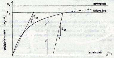 同時,應變在實驗中每一個初階段是不考慮的,在各向同性壓縮實驗(同時固結)的第一階段,硬化土壤模型是根據虎克定律 (Hooke’s Laws) 的彈性體積改變,但這些應變並不包括在式 (10) 中。在三軸試驗的側向荷載階段,軸向應變是綜合式 (9) 和式 (10) 得到: 當 在硬化土壤模型中還提出了一個 式中