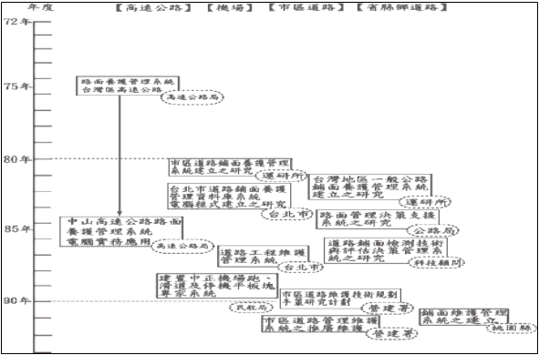 一、前言 1970年代PMS已在美國蓬勃發展,截至1987年時,全美已有41州完成了PMS之建構,1991年頒行的道路運輸效率法案(Intermodal Surface Transportation Efficiency Act of 1991, 簡稱ISTEA)更將PMS訂為聯邦法律所要求的六個管理系統之一,而PMS的建構與否將直接影響其聯邦補助預算之申請額度及優先順序。國內道路系統之新建工程已漸趨飽和,繼之而來的主要課題,當屬既有道路網的維護作業,若從長遠角度來看,養護工作的重要性並不遜於新建工程,亦即能有良好的養護作業,就能延長道路的使用年限並維護用路人安全與暢順的行車環境,同時還能節省公帑、展現政府施政效能。 自民國七十二年迄今,國內多個政府機關結合學術研究單位,針對不同道路等級、鋪面類型與應用層級業已建構數套PMS,大部分之系統均以柔性鋪面為管理對象,而其內涵與架構均為鋪面維護管理系統(Pavement Maintenance Management System;簡稱PMMS),雖然系統的發展已可與先進國家並駕齊驅,惟因國內主客觀因素的複雜影響,導致目前尚未有持續且實際運作之PMS落實於工程界,殊為遺憾。 本工程司有鑑於此,祈望藉由本身於材料檢測、分析領域的專業技術及豐富業績,再尋求具有卓越之PMS專業素養的中央大學研究團隊,組合成立國內PMS推動小組,以踏實的腳步,冀望落實台灣地區各道路PMS之建構與實務應用,其效益性除可快速擷取並分析鋪面平坦度指標、提供道路主管機關之養護決策判斷、增進維修品質、節省公帑外,更能以客觀的數據取信於民,尤其有利於年度預算之編列作業,達到利民、便民與保護用路人安全的多重目的。 二、國外歷年已建構之鋪面管理系統  PMS之發展與實務應用,以美國最為蓬勃,另歐洲地區則以北歐及西歐較為普遍,茲將其重要者條列如下﹝文獻(1)﹞:;(一) 美國 1. 德州柔性鋪面管理系統。 2. 加州鋪面管理系統。 3. 內華達州卡森市鋪面管理系統。 4. 加州長堤市鋪面管理系統。 5. Cash Western Reserve大學PMSC鋪面管理系統。 6. 陸軍及空軍M&R鋪面管理系統。 7. 堪薩斯州鋪面管理系統。 8. 伊利諾州鋪面管理系統。 9. 華盛頓州鋪面管理系統。 10. MicroPaver Version 4.0鋪面管理系統。 11. 都會運輸委員會鋪面管理系統。 12. 鋪面表面評估、評級與道路管理系統。 13.鋪面管理預測模型(Pavement Management Forecasting Model, PMF)。 14. PMS-ITRE - Pavement Management Software。 15. 道路表面管理系統(Road Surface Management System)RSMS96:MS-DOS、RSMS99:Windows 9x、NT。 16. 資產控制技術(Asset Control Technology, ACT)。 (二) 加拿大 安大略省EPMS鋪面管理系統。 (三) 英國 2. 英國CHART鋪面管理系統。 (四) 澳洲 1. (Road & Traffic Authority,簡稱RTA)RTA-NSW(The Roads and Traffic Authority of New South Wales)鋪面管理系統。 2. 昆士蘭州MMS(Maintenance Management System)。 (五) 荷蘭 1. CWMS鋪面管理系統。 2. 阿姆斯特丹市開發之鋪面管理系統。 (六) 丹麥 DMS鋪面管理系統。 (七) 法國 ALIZEIII鋪面管理系統。 (八) 北愛爾蘭 MARCHII鋪面管理系統。 (九) 巴西 SAMP鋪面管理系統。 (十) 牙買加 SIMP(SIMPlified Method for the Economic Evaluation)鋪面管理系統。 (十一) 科威特 HPMS(The Highway Project Management System)鋪面管理系統。 (十二) 沙烏地阿拉伯 PMMS(Pavement Maintenance Management System)鋪面管理系統。 (十三) 日本 Maintaining and Managing the Metropolitan Expressway之鋪面管理系統。 (十四) 中國大陸 北京SOGER(第二個衛星所建立之道路資料庫系統)。 (十五) 世界銀行(The World Bank) 引用巴西及美國資料發展道路設計養護計劃最佳化系統HDM(Highway Design and Maintenance Standards Model)。 三、國內歷年已建構之鋪面管理系統 自民國72年由交通部國道高速公路局所規劃之中山高速公路鋪面養護管理系統起,歷經產官學各界多年的努力研究與發展,至今已有多達12套鋪面管理之雛形及應用系統,不僅將鋪面工程導入管理層次,亦顯示國內鋪面工程領域之發展已臻世界先進國家之水準。台灣地區歷年來所發展之12套PMS整理如表1所示,而歷年PMS系統發展關係圖,如圖1所示。 (一) 現況概要 台灣地區公路建設在土木工程中扮演著相當吃重的角色,每年的投資經費亦佔最大宗之地位,目前每年需進行維修及養護之道鋪面積平均超過一億七千萬平方公尺以上,其中又以瀝青混凝土之柔性鋪面佔總鋪面里程的90% 以上,故針對此一主題,建立並有效執行PMS,已是刻不容緩的任務暨使命。
