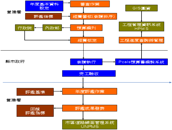 ![]() 圖1:台灣歷年PMS發展關係圖 我國目前市區道路管理及維護所需經費,除大部分仰賴中央政府所分配之汽車燃料使用費收入以外,直轄市及縣(市)等地方政府亦每年編制預算辦理市區道路年度鋪面養護作業。基於中央主管機關尚未訂定全國一致性評估準則,以作為分配市區道路建設經費之專業及客觀性考量的參考依據。故補助直轄市及縣(市)等地方政府之年度道路建設經費,僅能參考都市計畫區人口及道鋪面積作一概略計算,缺乏客觀的審查標準及機制,致政府之交通建設資源較難確實應用於亟需修復之市區道路鋪面,民眾對政府維修鋪面無一定標準,對一些尚堪使用之鋪面卻予以重舖,常視為政府消化預算之不當行為。而各縣市政府或鄉鎮市公所對鋪面維護之標準不一,有些縣市鄉鎮之鋪面達「超標準」之平整,有些縣市則破損不堪,致對全國欠缺統一標準之現象,實有待解決。故內政部營建署於九十一年對於「市區道路管理維護與技術規範手冊」進行連續四年之研究,目前獲得的研究成果係要求各縣市政府能先進行所轄路段的鋪面破損調查,提送內政部營建署作為進行市區道路養護經費發放之依據,待養護完成後由營建署再行委託檢測機構進行平坦度之檢驗,其流程如圖2所示。 另外,台北市政府工務局養護工程處,自2001年起進行民眾網路投票票選「十大路況不佳道路」以來,為有效說明其鋪面養護之成效,採用鋪面平坦度智慧型檢測車進行道路之平坦度檢測,以客觀數據提供民眾鋪面目前之服務現況。並自2004年起訂定道路養護完成後之檢測項目,以達到「燈亮、路平、水溝通」之施政目標。 (二) 目標需求 本工程司經由持續蒐集資料的結果,針對鋪面所需調查項目進行更深入的了解,並能充分掌握目前各單位所有的檢測儀器資源與鋪面實際之問題,俾利擬定檢測模式與管理機制。 對於鋪面何時才是到達維修程度,必須建立一個下限值,但是鋪面的損壞形式不同,要如何對各項調查結果進行評估,最有效的方法是將各種狀況建立一鋪面指標,較易決定其下限值。目前建議採用國際糙度指標IRI值為主。 鋪面之功能只在對於用路人提供良好舒適性與高安全性之服務品質,而鋪面績效綜合評估即是調查鋪面狀況之良窳,以及判定對用路者使用時所產生之各種影響。鋪面服務性能初設時具有較高的服務性質,隨著時間及累積交通量之增加而降低,當鋪面服務性能下降到某一狀況時,即須進行養護維修作業,俾使鋪面服務性能得以恢復,然而鋪面雖經養護維修後,亦會因使用年數之增加再度降低其服務性能,須再次進行養護維修工作,使服務品質再次提升。然而這些養護時機之建立,有賴於鋪面養護相關資料統計分析研判,再根據此信息作為安排各路段維修之優先順序。 國內鋪面工程每年所耗費之維護費用額度相當龐大,但卻一直無法提出高可信度且客觀的維護指標供百姓及審核機關參考,以至於鋪面維護的工作,幾乎年年在做、卻也連連被質疑成效不彰。此時,若能透過鋪面維護管理系統的建立,並逐步推展,將可建立一套數據化、客觀性的檢測資料庫,諒可達成最佳預算之編列作業及化解各方的狐疑,讓各級公務人員更加放心地從事公務。 依據設計準則,鋪面整體服務指數當下降至某一水準以下時,必須進行加鋪或維修等必要措施,俾以最經濟之方法提昇服務水準,並維持使用年限內應有之安全性與用路人之舒適性。這可藉由鋪面維護管理系統調查所得,進行成本與效益分析,並以最佳化分析結果建議最佳維修時間與所花費最節省的經費為目標。 由上述可知,鋪面績效預測及評估,不僅可預測未來鋪面服務績效及指標,更可對鋪面管理系統之規劃、設計、維護及評估等次系統提供強而有力的協助。職是之故,如何針對台灣地區道路系統特性及需求而建立一個適用的鋪面維護管理系統模式,以提昇整體鋪面品質,實為重要任務並為本工程司推動鋪面維護管理系統之終極目標。 (三) 服務特性 使用國際糙度指標方法,其特性如下: 1. 國際糙度指標不因時間之改變而改變其量測特性。 2. 國際間使用之平坦度量測儀器,均可採用直接或間接方式計算得到國際糙度指標。 3. 可應用於各種型式之鋪面,且IRI值之範圍涵蓋所有等級之鋪面。 4. 可客觀顯示鋪面狀況,不受人為因素干擾,瞭解鋪面狀況對於使用者成本、安全性及行駛品質所產生之影響。 5. 全路段可分段(一般為100m一段)依IRI值之大小進行排序,若年度預算不敷運用時,可採用累積曲線法,篩選出必須優先辦理維修之鋪面。IRI門檻值亦可依年度預算之多寡作彈性調整。這是採用國際糙度指標IRI值作為鋪面品質評估之依據最大優點之所在。 五、實施方法及工作項目 PMS所涵蓋的層面及工作項目既多且雜,唯仍以鋪面績效預測及評估的作業較為重要。另據國外文獻指出,上述兩項作業至少應具備下列之功能或目的﹝文獻(3)﹞:(一) 了解國內檢測儀器現況及使用績效 (二) 了解國內各交通管理單位鋪面檢測需求 (三) 各檢測項目之表格建立 (四) 鋪面維修模式之建立 (五) 維修下限值之建立 (六) PMS資料庫與系統模組建構 (七) 提供適當的養護暨整修策略 (八) 達成最佳預算之編列 (九) 鋪面整體使用年限成本與效益分析 (十) 回饋設計方法與結果 ![]() 圖2:市區道路養護實施策略作業流程圖 六、工程實務效益性探討 (一) 傳統人工作業