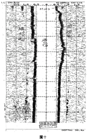 E.檢討: 疑JSP樁體侵入連續壁之範圍,致廠商於進行抓斗抓掘槽溝時有相當之困難性,雖經採衝削整修之方式進行,仍導致開挖壁面有擴大之情形,惟完成之壁體經檢測後仍能維持相關穩定之狀態。 ![]() ![]() 3. F100母單元 (1) 施作時程:11/18 16:30~11/22 08:30,約費時88時。 (2) 穩定液管理: A.比重:1.005~1.01 B.黏滯度:34~43秒 C.含砂量:0.01~0.25% D.Ph值;10.1~10.9 (3) 槽溝抓掘:(詳超音波圖九) A.第一刀:抓掘至約GL-7m處之擋土側仍疑遇JSP樁體,經廠商採以抓斗邊衝擊、邊抓掘之方式進行至GL-18m處後即抓掘正常,惟該段壁體有擴大之情形,且其垂直精度勉強符合1/300之要求。 B.第二刀:狀況與第一刀完成時類似。 C.第三刀:JSP樁體無侵入,抓掘順利,垂直精度控制在1/300以內。 (4) 混凝土澆置(詳灌漿記錄曲線表九): A.估計用量:134.82m3 B.實際用量:145.00m3 C.灌漿記錄曲線與超音波圖比較:混凝土超用區域(GL-20~0m)與超音波圖顯示結果大致符合。 (5) 檢討: 疑JSP樁體侵入連續壁之範圍,致廠商於進行抓斗抓掘槽溝時有相當之困難性,雖經採衝削整修之方式進行,仍導致開挖壁面有擴大之情形,惟完成之壁體經檢測後仍能維持相關穩定之狀態。