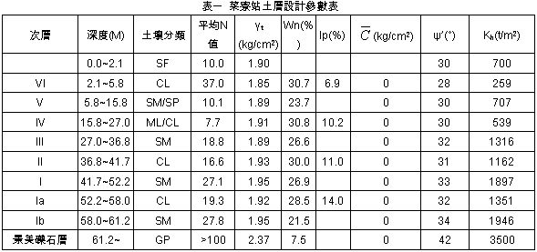 一、前言 臺北捷運新莊線CK570C區段標工程為確保連續壁之施作安全,於契約中要求廠商於整體連續壁施工前,應於工區內挑選某區域先行佈設監測儀器及進行連續壁測試,以觀測及紀錄連續壁施築過程中之壁體穩定度、地表沉陷情形是否造成鄰房傾斜等狀況,以作為後續連續壁施工參數之參考。現擬就臺北捷運新莊線CK570C區段標中所屬菜寮站連續壁測試單元之施作成效做一報告,以供各位工程先進參酌。 二、案例基地概況 臺北捷運新莊線CK242標菜寮站位於三重市重新路三段上,其主體工程包含站體、橫渡線、三個出入口及二個通風井(詳圖一),車站主體為地下二層之鋼筋混凝土結構,呈東西向之長方形,車站長約222.85公尺,寬約21.15公尺,地下開挖深度約19.2~21.85公尺,採明挖覆蓋工法施作。橫渡線位於菜寮站西端至忠孝高架道路間,為地下一層之結構物,長度為106公尺,寬度為21.2公尺,開挖深度為19.2公尺,採明挖覆蓋順打方式施工。 另該車站南側有一聯合開發基地,該基地位於重新路三段與光明路交叉口東南角,沿重新路三段面寬約72m,深度約21m,呈長方形,基地面積為1451㎡,全部屬聯合開發之範圍。 ![]() 三、土層狀況與地下水狀況 本工程之地勢平坦,地表高程約為102.5m~103.5m (以基隆平均海水面訂為100m為基準),其主要係位於台北盆地第四紀沖積層上方之松山層內,松山層厚度約61公尺,其典型之地層特色為粘土與砂之互層,若由地表下深度約61m之景美卵礫石層頂面起算向上可將地層概分為六個次層,其中第一、三、五次層為砂性土壤,第二、四次層為粘性土壤,一般典型的台北盆地松六層在本工址已不明顯或較薄。工址之地表下1.0~3.0m為表土層,其下為1~6.6m厚之粉土質黏土層;粉土質黏土層之下為8~14m厚之砂土層;砂土層下為中等堅硬之粉土質黏土或黏土質粉土為主,厚約8~13.5m;黏土層下之地層則稍嫌凌亂,主要由粉土質砂或砂質粉土夾粉土質黏土所構成,厚約33~37公尺;卵礫石層出現深度大致上位於地表下61m以下,該工程之簡化地表層剖面詳表一、圖二。 本工程沿線之地下水位約位於地表下0.2公尺至1.6公尺之間,地表下17.0公尺以上之地下水壓約呈靜態水壓力分佈(詳圖三)。其相對總水頭之變化見圖四,而於地表下58公尺以下之地下水壓比靜態水壓之分佈約低6m,此現象可能為台北盆地景美層之地下水被超抽所致。 ![]() ![]()