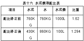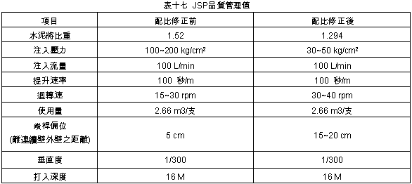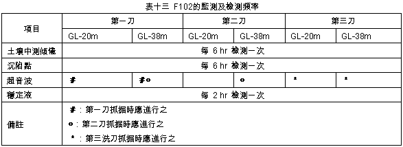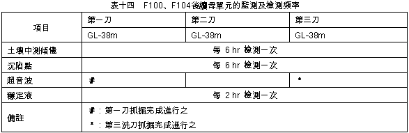 A.第一刀:除GL-2~-5m處之開挖側有微坍外,其餘垂直精度良好。B.第二刀:第二刀抓掘中發生偏微計故障,而導致挖掘作業停止,待修期間廠商分別進行二次超音波之檢測工作,檢測結果位於第一刀GL-2.5~-11m處之擋土側壁面有些許剝落,研判係因開挖後偏微計損壞至修護完成期間,該壁面懸置長達23小時,致附著於JSP樁之薄層砂土掉落所造成。 C.第三刀:完成抓掘後進行超音波之檢測,檢測結果壁面狀況並無明顯變化。 (4) 垂直精度均在1/300以內。 (5) 混凝土澆置(詳灌漿記錄曲線表七): A.估計用量:134.82m3 B.實際用量:140.00m3 C.灌漿記錄曲線與超音波圖比較:混凝土超用區域(GL-11~0m)與超音波圖顯示結果大致符合。 (6) 檢討: 本單元施作時間長達56.5小時,主因係新組立之機具故障、檢修調整所致,施工過程並無特殊狀況。 2. F104母單元 (1) 施作時程:11/16 00:45~11/17 24:00,約費時47.5時。 (2) 穩定液管理: A.比重:1.005~1.006 B.黏滯度:35~44秒 C.含砂量:0.01% D.Ph值;10.2~10.8