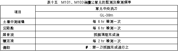 單一洗刀:a.由於F104單元西側進行混凝土澆置時發生漏漿之情形,故將原規劃最後進行之連續壁M103提前進行洗刀抓掘及單元接頭清理作業,另M101則調整為最後一個單元。 b.抓掘過程順利無障礙,惟GL-2~-20m壁面有土體剝落現象,GL-20m以下則狀況穩定正常,另與兩端相鄰母單元之端版,尤以與F104相接之漏漿處經超音波檢測結果,顯示均已處理乾淨,垂直精度控制在1/300以內。 (4) 混凝土澆置:(詳灌漿記錄曲線表十): A.估計用量:224.7m3 B.實際用量:232.0m3 C.灌漿記錄曲線與超音波圖比較:混凝土超用區域與超音波圖顯示結果大致符合。 (5) 檢討: A.GL-2~-20m壁面有土體剝落現象,廠商研判應是附著於JSP樁之薄層土體脫離所致。 B.鋼筋籠原為M101單元,因受F104澆置混凝土產生漏漿之意外,故重新製作本單元之連續壁鋼筋籠,而有所耽誤時程。 4. M101公單元 (1) 施作時程:11/24 07:30~11/25 04:12,約費時20.5時。 (2) 穩定液管理: A.比重:1.01 B.黏滯度:32~39秒 C.含砂量:0.01~0.025% D.Ph值;9.2~13.5 (3) 槽溝抓掘:(詳超音波圖十一)