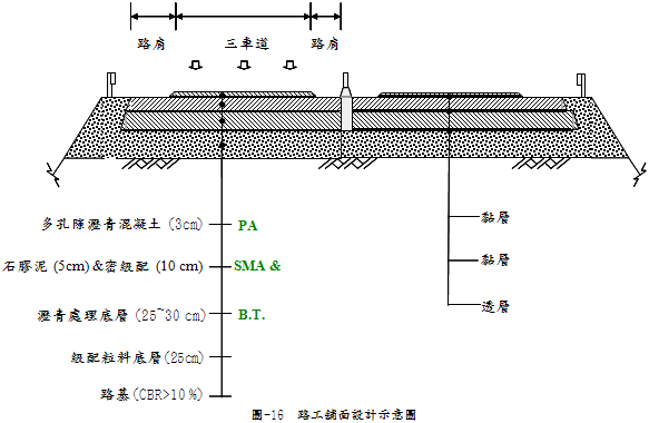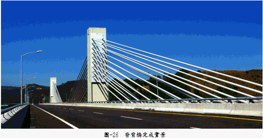 | 一、計畫源起南投縣為臺灣唯一不臨海,縣境多山之縣份,主要產業以農產品及秀麗山水之觀光產業為主,近年來政府大力推動「無煙囪工業—觀光」之發展,南投縣之觀光產業經地方政府及民間力量的共同努力,已有相當亮麗成果,惟現有且唯一之主要道路台14線每逢連續假日即出現車潮壅塞之情形,嚴重影響遊客前往觀光景點旅遊慾望,為改善此情形,各界極力爭取建設一條快捷之高速公路,政府體察民眾殷殷期盼之情,並考量縮短南投縣埔里鎮、國姓鄉及草屯鎮與台中都會區之城鄉差距,全力協助提昇南投縣觀光產業發展競爭力之目標而決定規劃設計施作「國道6號南投段工程」,全長37.6公里。 二、工程概述(一) 工程名稱:國道6號南投段第C608標埔里隧道及愛蘭交流道工程 (二) 發包金額:23億4,600萬 (三) 開工日期:93年3月18日 (四) 完工日期:96年11月8日 (五) 主辦機關:交通部臺灣區國道新建工程局 (六) 設計單位:中興工程顧問股份有限公司 (七) 監造單位:中興工程顧問股份有限公司 (八) 施工單位:利德工程股份有限公司 本標工程計有 2 路段 第一路段 第二路段  圖-1 國道6號南投路線平面及構築示意圖   圖-2 C608標工區分佈位置 三、設計理念 上述四大設計理念分述如下: (一) 路線幾何 國道6號路線原規劃路線為中橫快速道,為配合現階段路線終點之設計,計劃路線採90°彎度銜接台16線省道。路線平曲線半徑以行車速限80-60-40 kph 各加10 kph,線形曲線規劃為R5,000(左)- A151- R320(左)- A151- A102- R160(右)- A102- R92(右)- A68- 直線(圖-3),交流道環道路肩加寬,拉長失控車輛撞及護欄前之應變時間,降低事故可能性或嚴重性(圖-4)。  圖-4 交流道環道路肩加寬 隧道火災時,用路人第一時間獲得資訊和逃生,是避免生命損失的首要原則,並以顏色區分逃生門和其他功能門,人行聯絡隧道(逃生隧道)門與主隧道壁齊平,聯絡隧道(逃生隧道)門、緊急電話間於側隧道壁塗繪大型圖案標示(圖-5)。  圖-5 隧道逃生設施配置 埔里隧道路段路線縱坡度 1.370%,路線縱坡度小於 2%,增加車輛行駛速發揮動力最大效益,降低車輛排放的污染物排放量(圖-6),利用自充填混凝土材料減少水泥使用,減少CO2之排放(圖-7)。   本工程為減少資源的浪費與提升資源的再利用,自充填混凝吐膠結材之45﹪利用煉鋼爐之石粉代替水泥、隧道與基礎開挖之土方做為路堤填築材料,避免土方堆棄造成環境污染、利用水庫沉積之迂泥鍛燒輕質骨材代替混凝土配比之天然骨材,降低河川氾濫開採(圖8~10)   第C608標因位處埔里盆地群山環繞景致優美,為避免用路人因隔音牆阻隔風景之通視,乃採用透明材質之隔音牆(圖11),以利觀賞週遭山景,可大大降低封閉感。   交流道處主線路堤構築路段原為水作田,屬濕地性質基地,由於水源穩定,水質良好且緊鄰南港溪與眉溪間,利用匝、環道高架橋構築之空間,設置生態池進行棲地補償(圖-13),主線路堤段以生物廊道提供水、陸生物通行,灌排水溝設置逃生爬坡供落溝生物脫離,永續該區域豐富生態環境之發展(圖-14)。   (七) 脊背橋 脊背橋位於愛蘭交流道絡道高架橋前段,總長為300公尺,跨徑配置為80+140+80公尺,橋面全寬25.95公尺,橋塔較橋面高出20.25公尺,藉由橋塔兩側斜拉鋼纜的協助,梁深僅約一般梁橋之60%,使梁體更為纖細。施工方式採懸臂工法施作梁體節塊,斜拉鋼纜則配合節塊施工進度佈設,利用脊背橋優美簡捷的線條融入周圍天然美景並成為埔里地區新地標(圖-15)。 斜拉鋼纜之鋼腱採可單根抽換設計,鋼索與外護套管(HDPE)間以聚氨酯(發泡劑)灌注,作為鋼腱防銹保護措施,在維修上已事先考量其適用、安全及快速性。  自充填混凝土具有「澆置過程不須施加任何震動搗實,完全藉由混凝土自身之高流動性通過鋼筋間隙填充至模版各角落」能力之混凝土,由於該混凝土具有高流動性、抗析離性、高度之自充填特性,大幅提昇傳統混凝土因充填不實所造成之蜂窩及外觀不佳之情形,膠結材因採用爐石粉替代水泥及免振動減少施工成本而具有其經濟性(表-1~3)。    臺灣自 1970 年代闢建高速公路,引進使用開放級配、密級配、瀝青處理底層鋪築路面,歷經多年使用經驗,重車易造成路面車轍及雨天時路面排水不佳的問題,亟待變革性解決,歐洲地區國家經卅多年研究、改善與推廣,現在多用抗車轍之大粒徑石膠泥結構層與排水性面層鋪築路面,除改善上列問題外,亦可有效降低路面行車噪音。本工程,除隧道內採剛性路面外,路工段在傳統BTB及DGAC上層鋪設石膠泥瀝青混凝土(Stone Mastic Asphalt 簡稱SMA)及多孔隙瀝青混凝土(Porous Asphalt Concrete 簡稱PAC ),橋工段則在DGAC上層全面使用PAC(圖-16~17)。   為營造高速公路橋下墩柱與沿線環境之融合,本工程橋墩設計型式計有4M∮圓柱、橢圓形扁柱及多邊造型柱,利用光線投射角度呈現墩柱陰影之變化(圖-18)。  四、工程施工特點(一) 首座脊背式橋梁,鋼索配置採平行拉索,可進行單根鋼腱抽換。 脊背式橋梁造型與斜張橋類似,惟橋塔較低,結構量体不致太過龐大;其斜拉鋼索結構上視為外置預力,應力變動幅度較低,可提高鋼索之抗疲勞能力,施工亦較斜張橋簡單,本案採 80+140+80 公尺跨度配置,斷面為雙向共構,僅於雙向結構中央設置單柱橋塔及單一鋼索面,造型特殊但結構線條可維持簡潔性(圖-19~26)。      傳統混凝土因受限坍度之規定,施工階段必須要有相當人力與振動設備進行